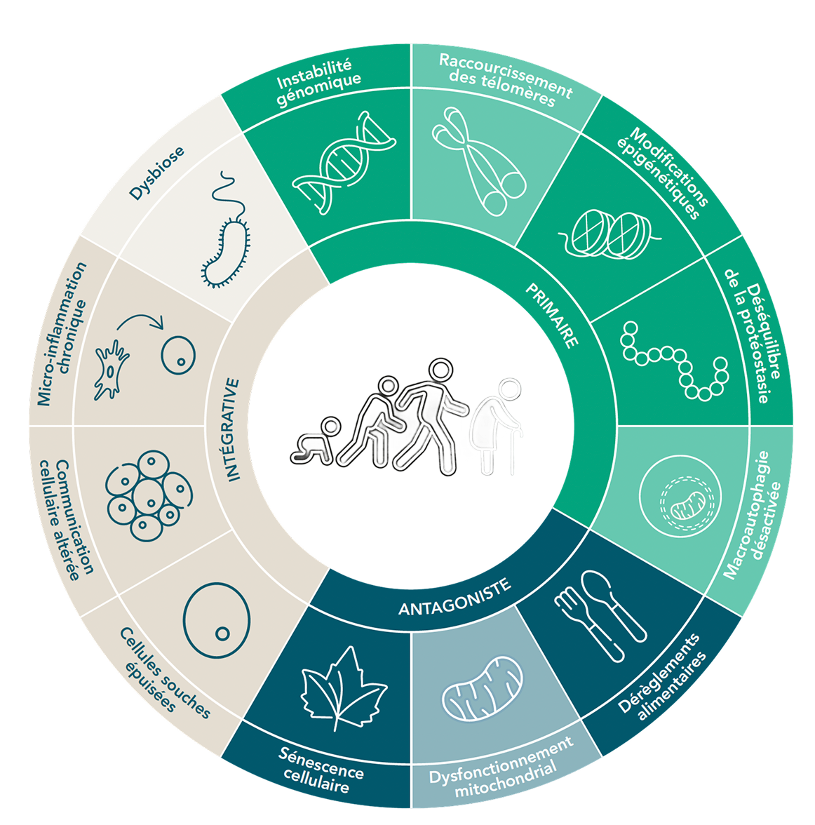 La recherche internationale a mis en lumière un déclin physiologique au cours de l'âge qui tient à différentes "caractéristiques", récemment résumées dans une représentation schématique : la roue de la longévité.